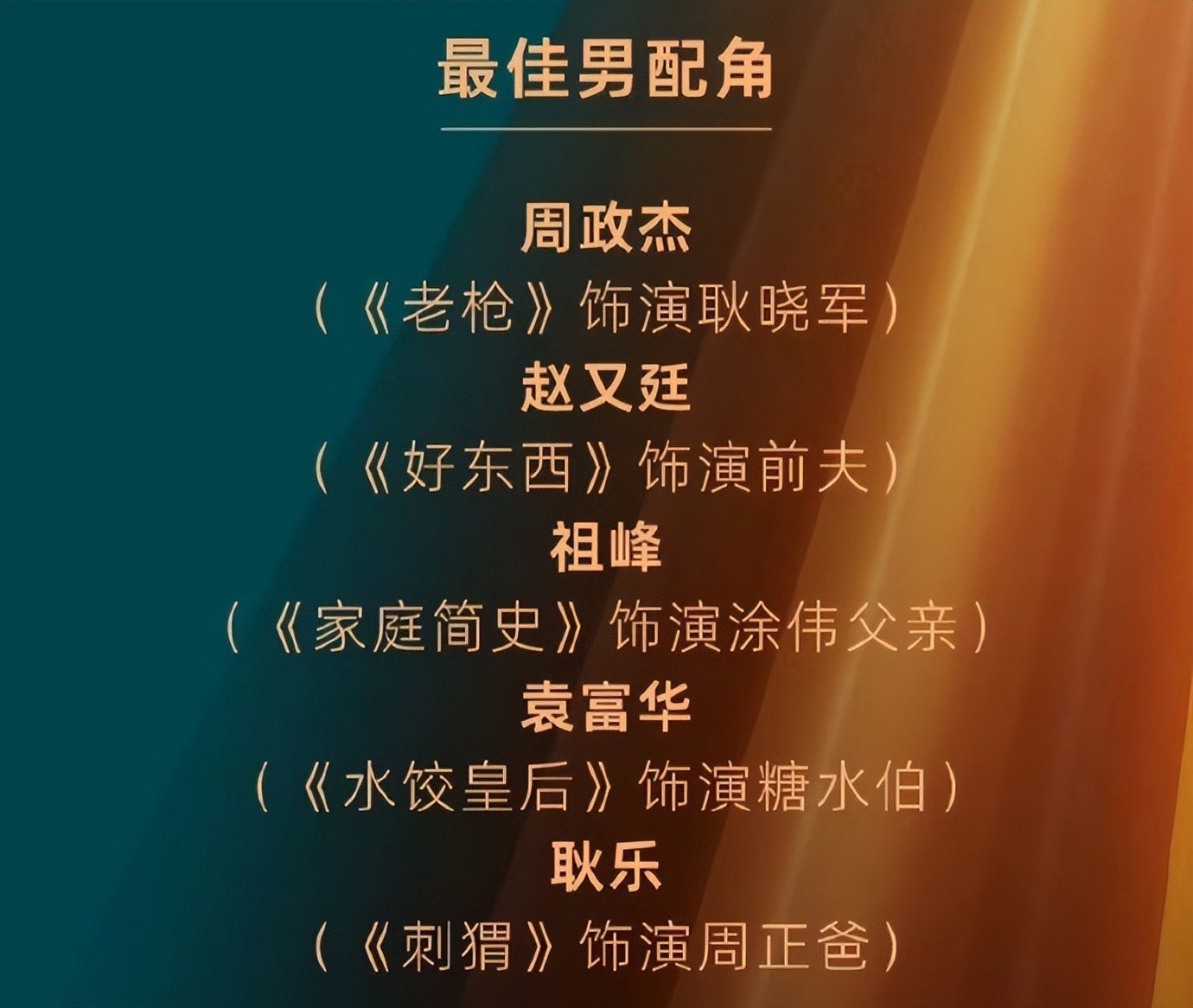 本届角逐最佳男配角的五位演员,原本能对祖峰构成威胁的只有《水饺皇后》里的袁福华,他拿奖的概率非常高,可惜就这样与奖项失之交臂了。